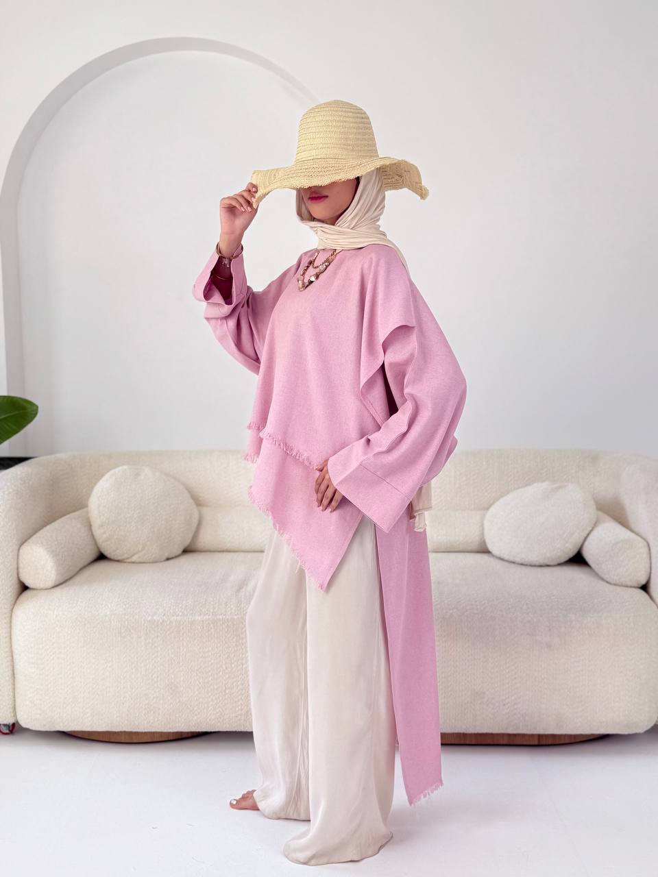 This linen high-low top showcases an asymmetric silhouette with a tall back and a double-layered front, each layer differing in length to create visual interest. Made from breathable linen, it ensures comfort and coolness during warm days. The fringed edges add a subtle, summery texture, making it an ideal choice for those seeking both style and ease in their warm-weather wardrobe. Designed in one size, this top combines expert craftsmanship with versatile wearability.