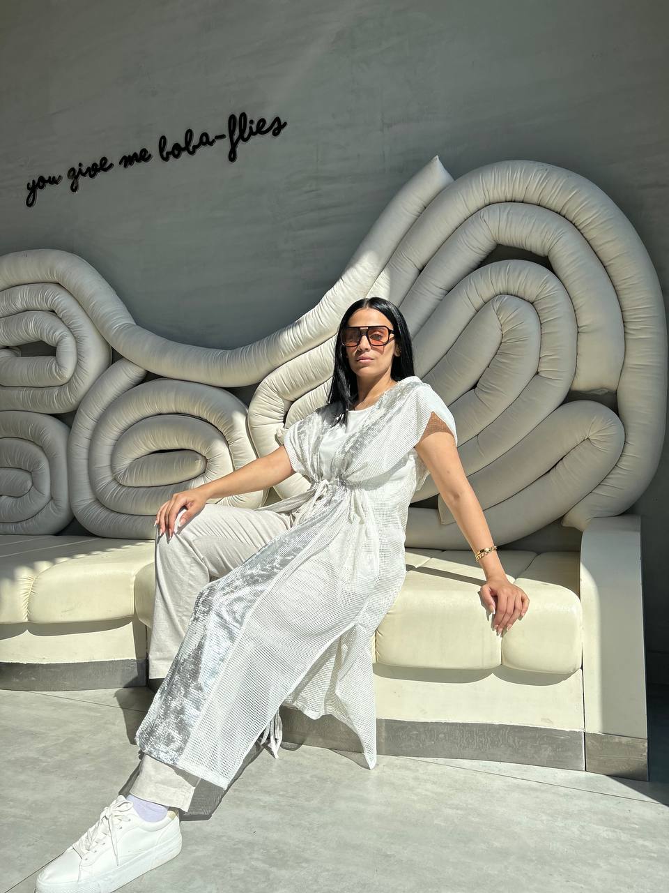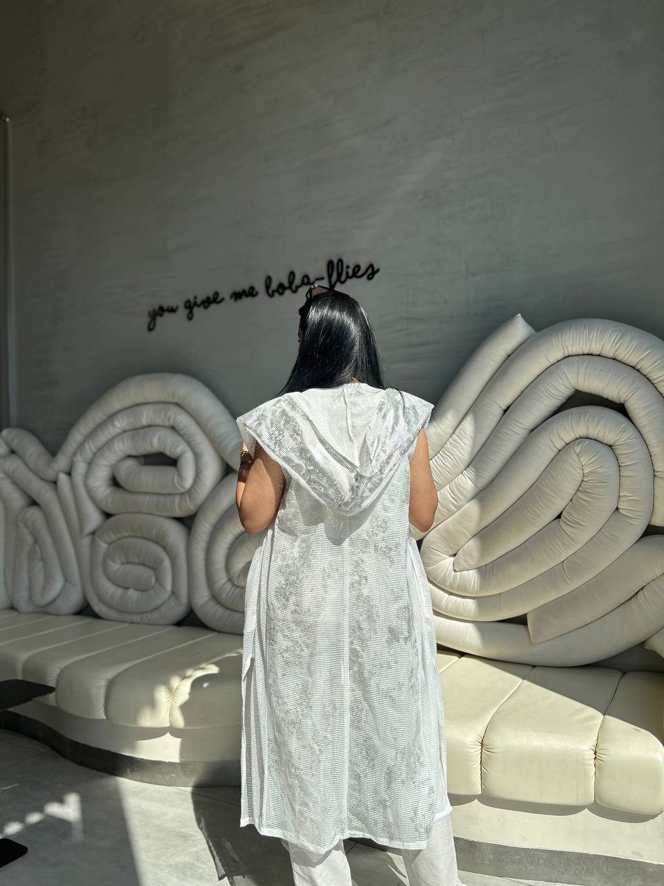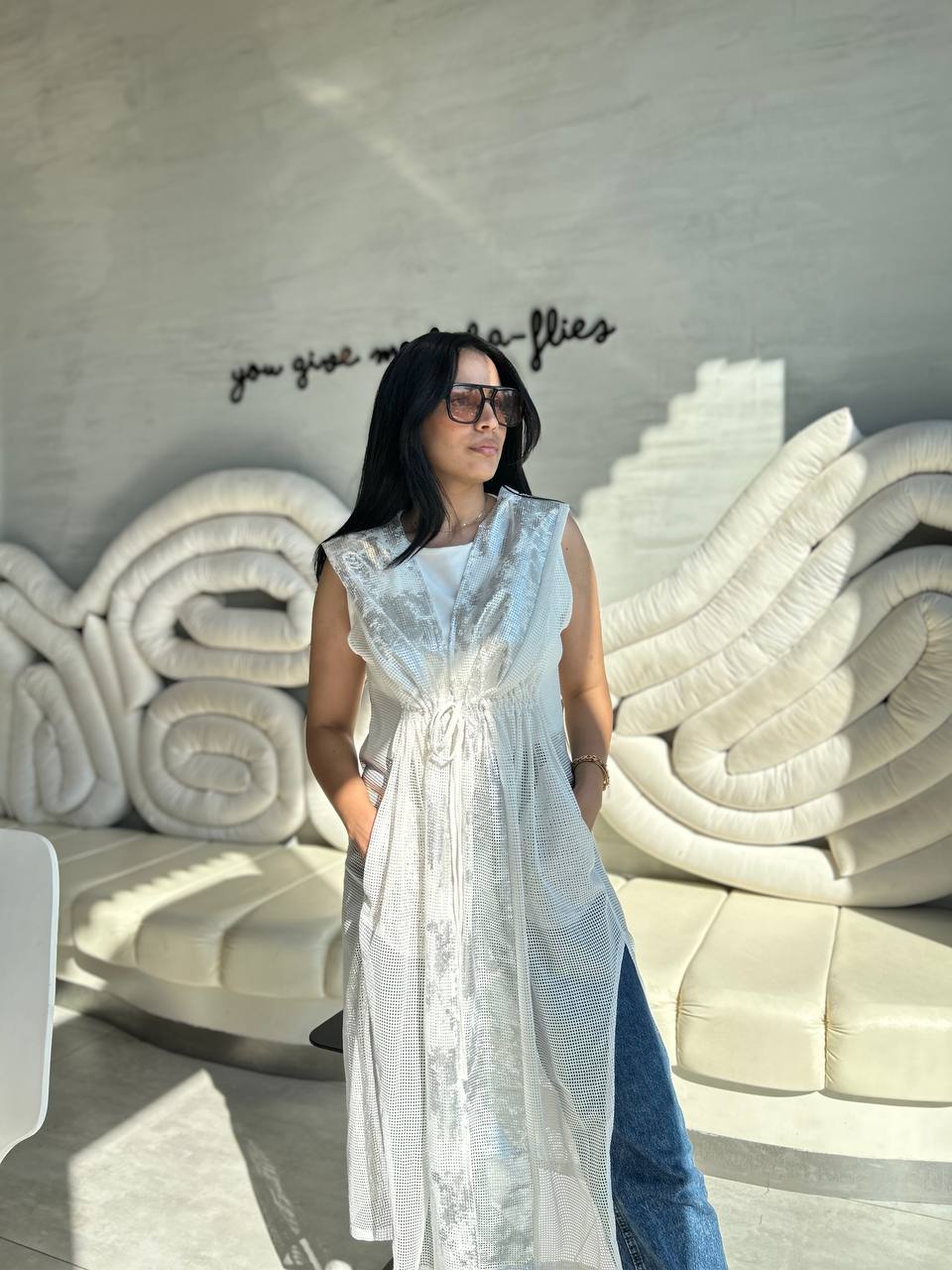 The Net vest is a versatile and stylish accessory perfect for layering, as a fashionable cover-up on the beach, and even for special occasions. Made with adjustable waist and a white and silver net material, it offers a trendy and comfortable fit for all sizes. Elevate your style with the Net vest.