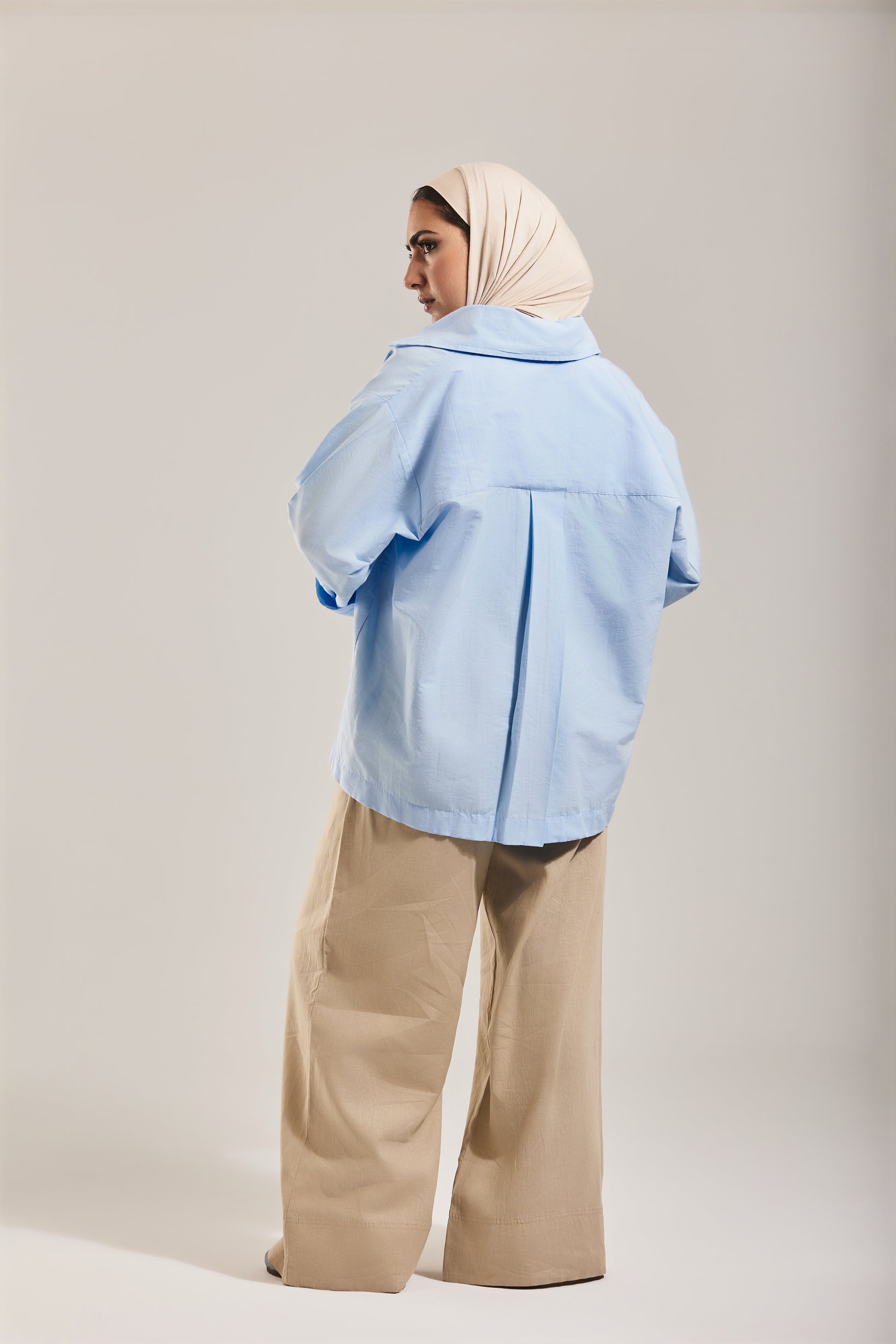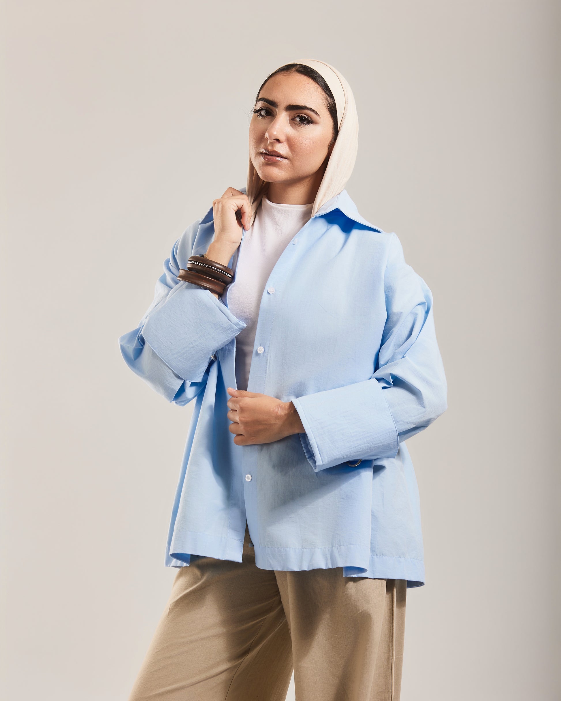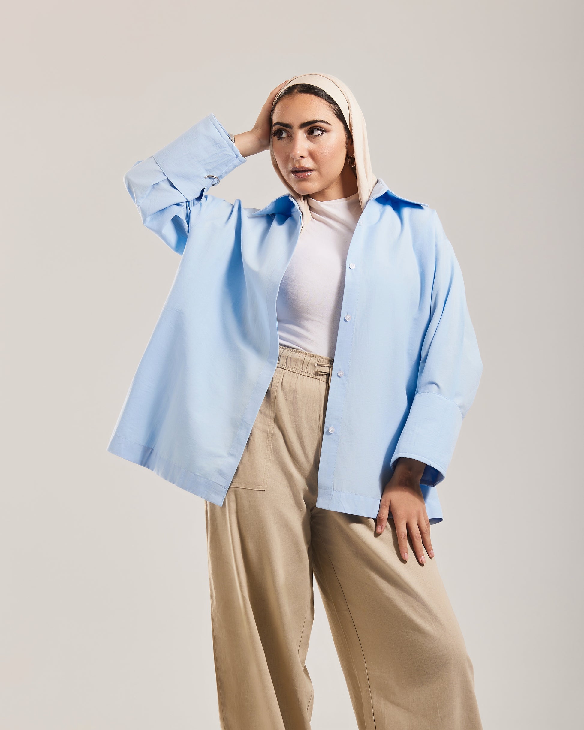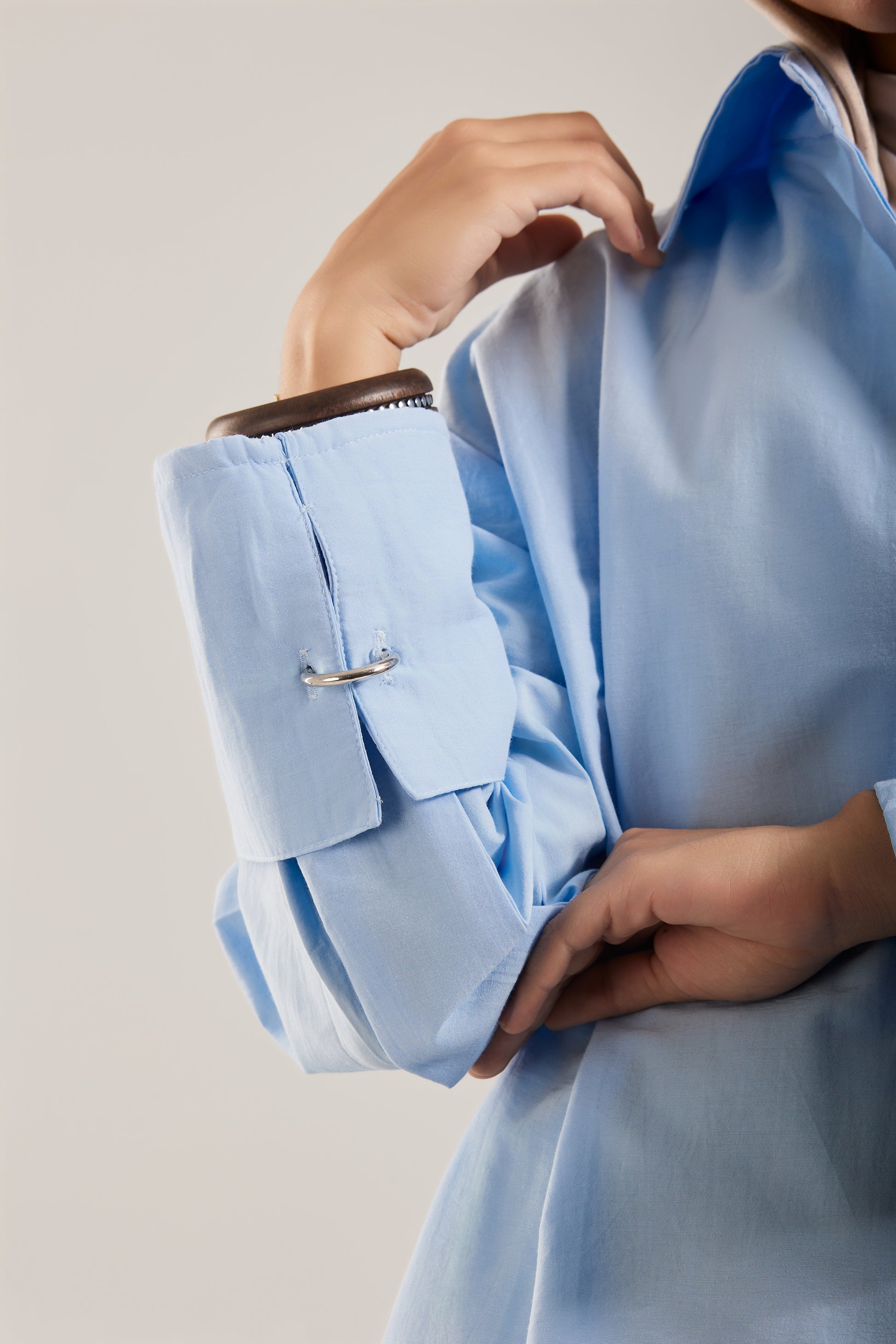 Our baby blue oversized shirt is the perfect addition to your wardrobe. Made with high-quality poplin material, it is soft and comfortable for everyday use. The ring detail at the end of the sleeve adds an elegant touch to this versatile shirt, available in both s/m and l/xl sizes.