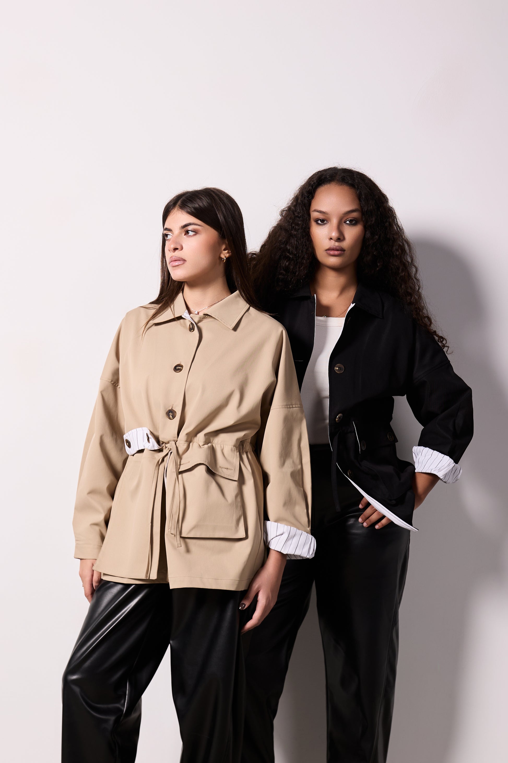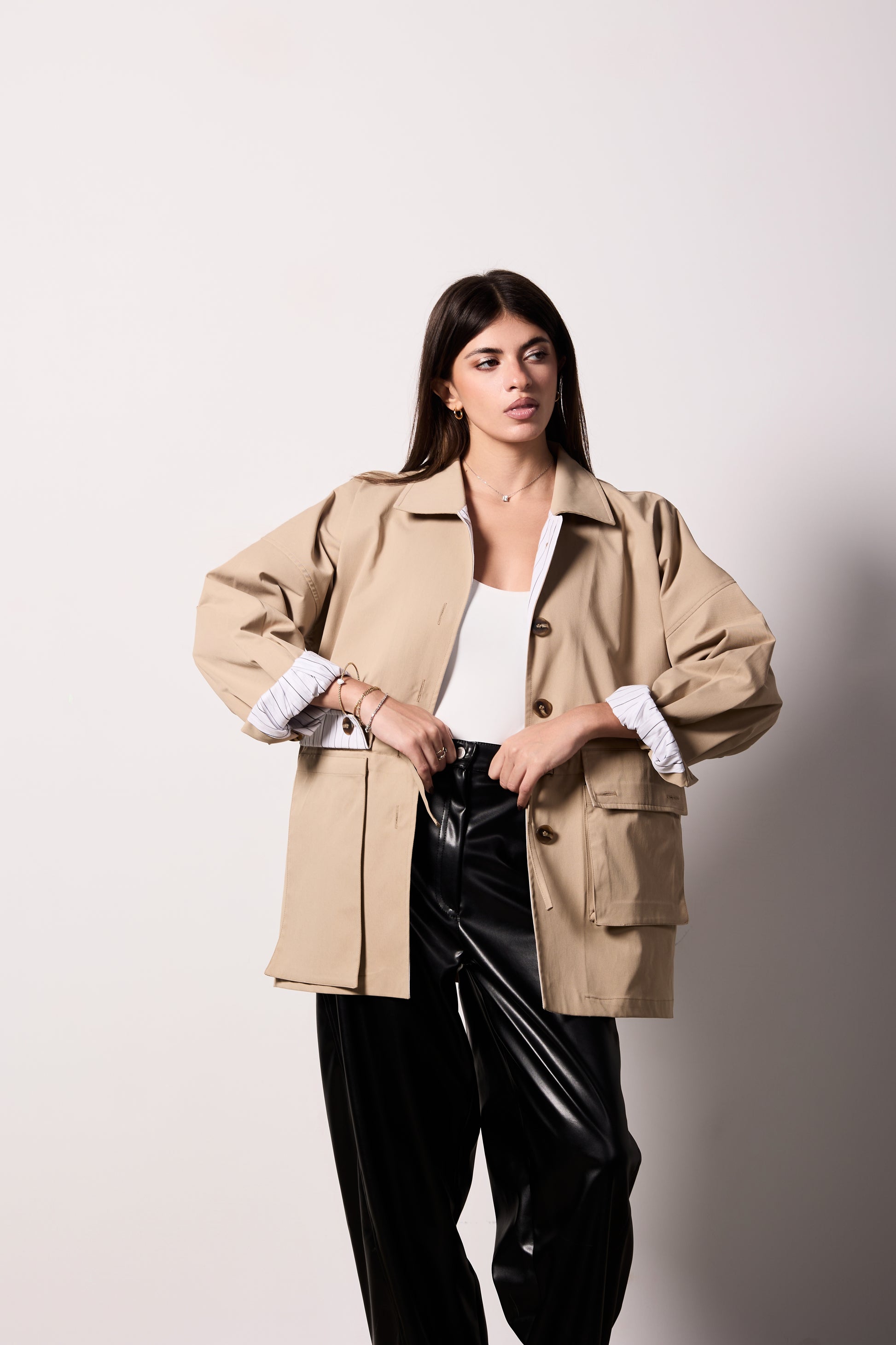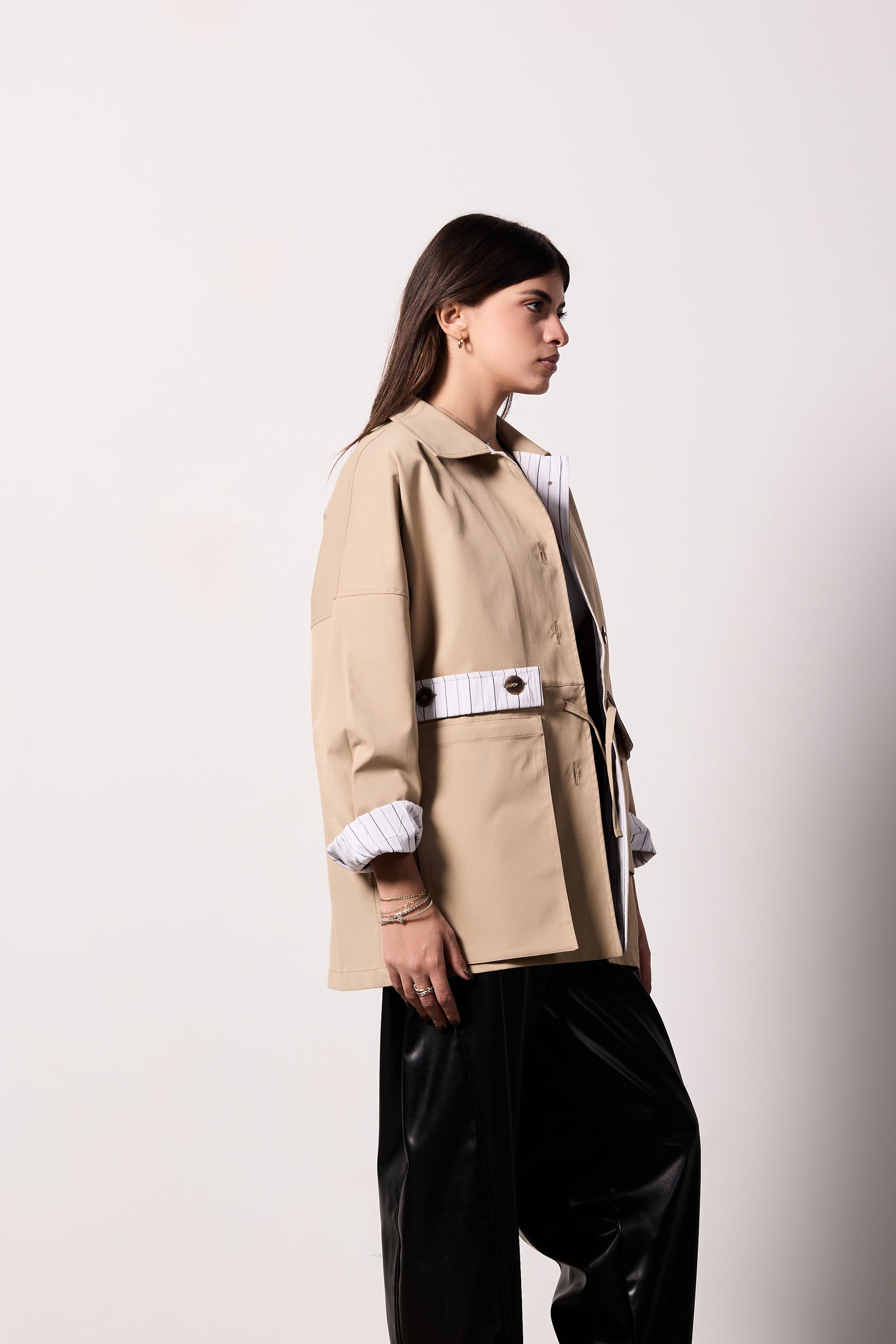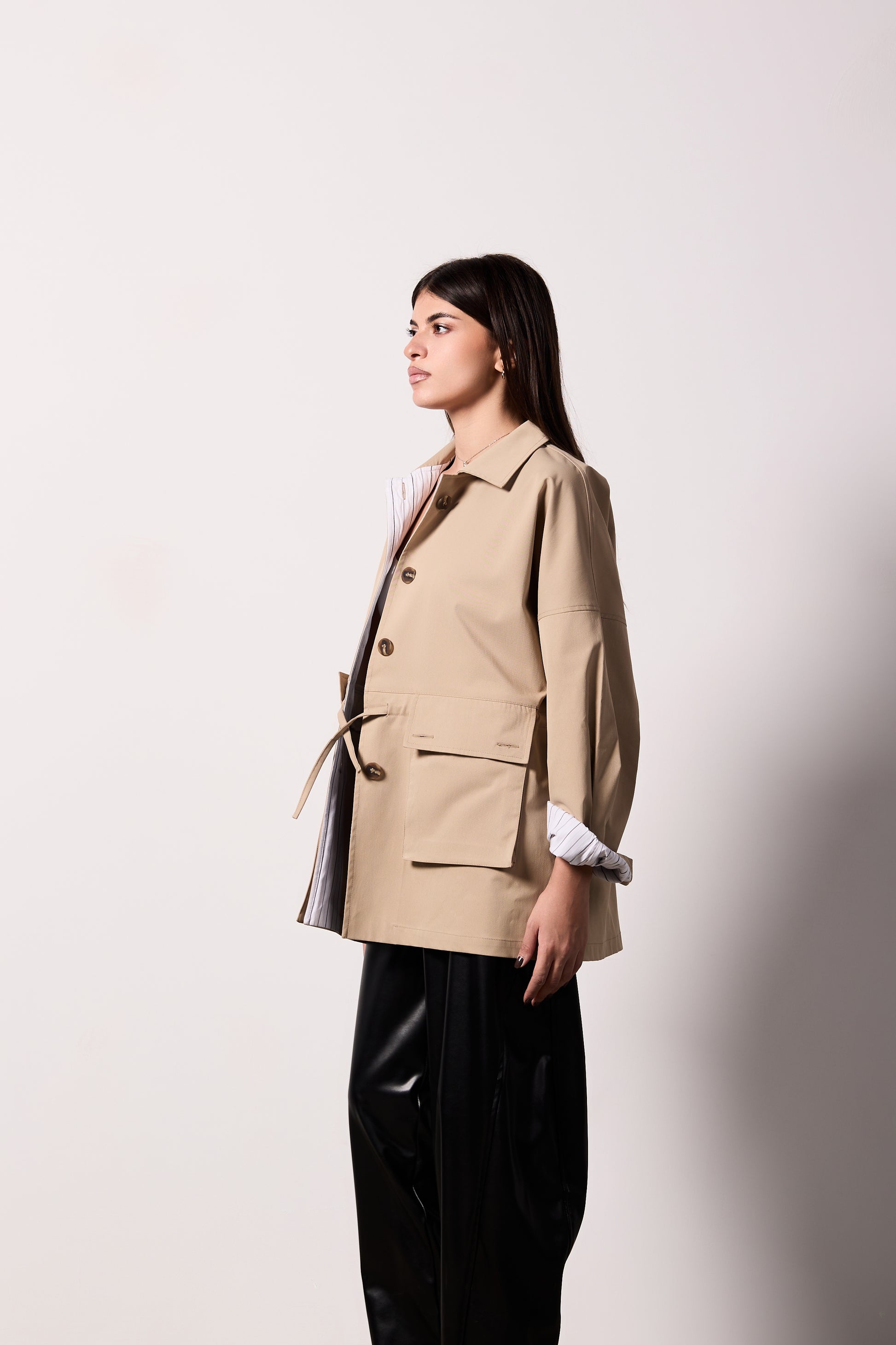The SORA Jacket redefines effortless sophistication with its modern trench silhouette crafted from premium gabardine. This chic statement piece features signature striped lining and refined button details on the sleeves, delivering both visual interest and practical elegance. The adjustable waist ensures a flattering fit for every frame, while the short, non-cropped length offers versatile styling for any occasion. One size fits all, making it the ultimate minimal wardrobe essential that transitions seamlessly from day to night.